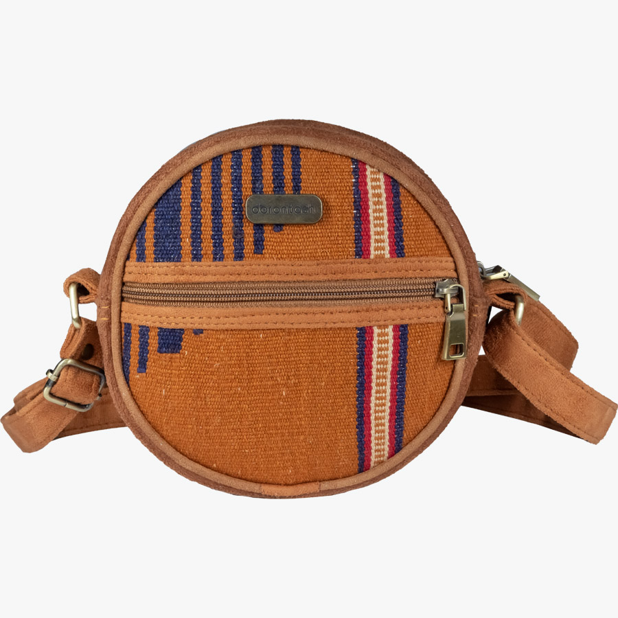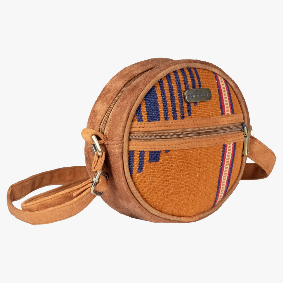 کیف گلیمی دایره از گلیم دستباف تهیه شده و دارای یک بند بلند قابل تنظیم است که میتوان آن را به صورت کج استفاده کرد . همچنین دارای یک جیب اصلی و یک جیب در قسمت جلو است .